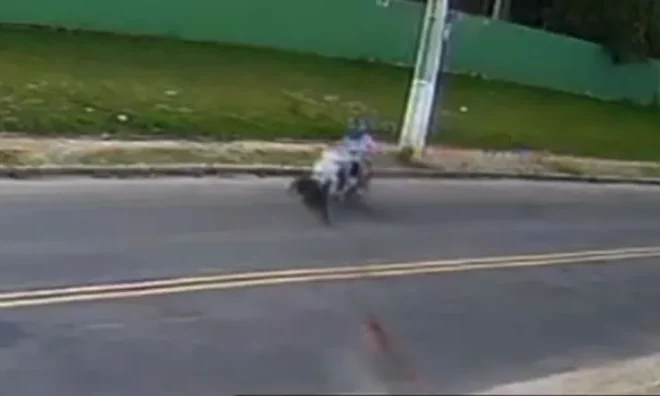 Cachorros que corriam pela Avenida 25 de Agosto, no bairro Aeroporto Velho, em Cruzeiro do Sul, derrubaram uma motocicleta com duas mulheres que seguiam pela via na tarde desta segunda-feira, 4. O acidente foi filmado por câmeras de segurança e apesar da gravidade, as duas passam bem, sendo que uma delas, de nome Thais, sofreu pancadas na cabeça e no quadril.