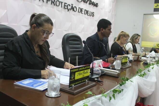 Logo após a confraternização, iniciou-se nesta terça-feira 8 de março a Sexta Sessão Ordinária que contou com a presença dos vereadores Jurandir Queiroz (PROS), Leonir de Castro (PP), Marinete Mesquita (PT), Marquinhos Tibúrcio (MDB), Neiva Badotti (PSB), Rogério Pontes (PROS), e da Presidente Arlete Amaral (SD).