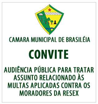 O Presidente da Câmara Municipal de Brasileia, Mário Jorge Gomes Fiesca, convida os moradores da reserva, comunidade da zona rural, autoridades locais e regionais, Entidades Civis Organizadas e a população em geral para participarem da Audiência Pública que terá como objetivo debater as multas aplicadas aos moradores da Reserva Extrativista Chico Mendes, ignorando-se o tamanho da área permitida, para a formação de roçados de subsistência, em áreas de reservas extrativistas, assegurado pela Legislação ambiental.