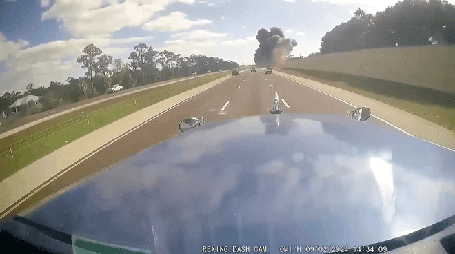 Dispositivo instalado no para-brisa de um veículo gravou imagens, compartilhadas nas redes sociais, que mostram a aeronave voando baixo, pouco antes de tocar o asfalto e pegar fogo na rodovia Interestadual 75, perto de Naples, no sudeste do estado americano. As imagens são da Reuters.