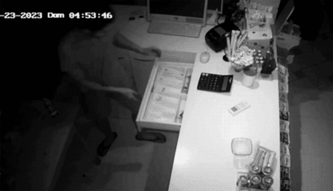 Já dentro, o ladrão levou pouco dinheiro trocado que estava dentro da gaveta do balcão...