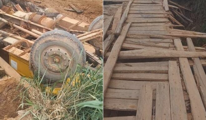 Um caminhão tombou quando passava por uma ponte que dá acesso ao Ramal dos Mineiros, que dá acesso à Comunidade da Vila Nova Aldeia, localizada no município de Senador Guiomard interior do Acre, na manhã desta quarta-feira (26). O veículo ficou com as rodas para cima. Um vídeo, gravado pelo diarista Eduardo Bandeira, mostra como a caçamba ficou após cair e as condições da ponte.