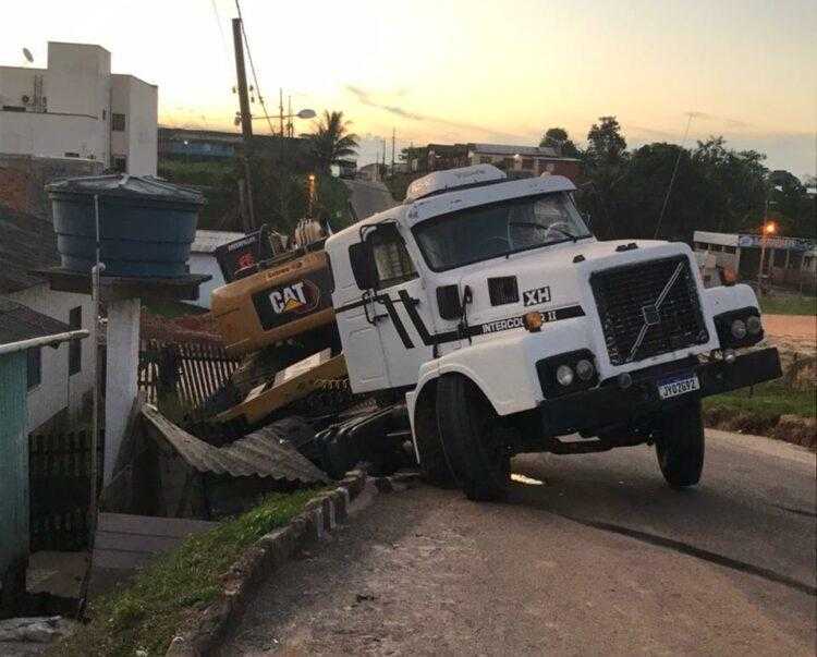 Um caminhão que transportava uma máquina pesada não teve força para subir uma ladeira, desceu de ré e caiu sobre a varanda de uma casa. O fato aconteceu na tarde de terça-feira (15), em Cruzeiro do Sul, no interior do Acre.