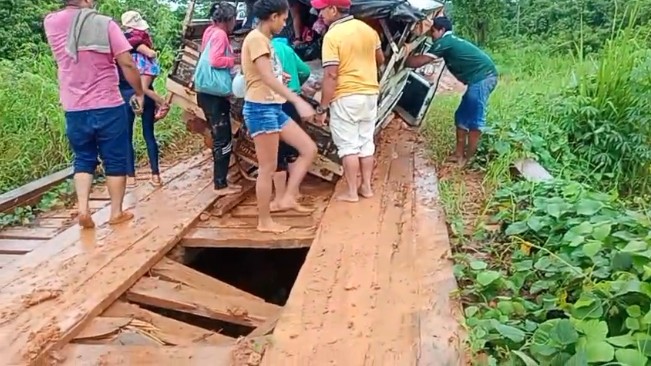 Imagens que circulam nas redes sociais mostram o veículo pendurado à beira do igarapé, sustentado por apenas uma das rodas. Os passageiros – entre eles crianças – aparecem em desespero enquanto descem da carroceria com ajuda de moradores e outros condutores que passavam pelo local.