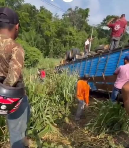 Um caminhão carregado de bois tombou na manhã desta quinta-feira (23) na BR-364, no trecho que liga os bairros Custódio Freire e Universitário, em Rio Branco. O veículo, que vinha do município de Bujari com destino à capital, saiu da pista após o motorista perder o controle da direção.