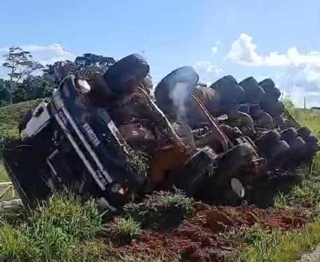 Um caminhão guindaste tombou na BR-364 na manhã desta quarta-feira (12), entre Sena Madureira e Manoel Urbano. Imagens de vídeo registraram as cenas pós-acidente.
