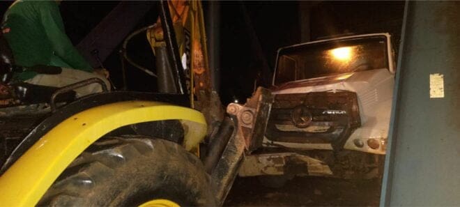 Um trator foi acionado para fazer a retirada do mesmo, mas foi necessário acionar um segundo trator para ajudar o primeiro a retirar o caminhão da ponte.