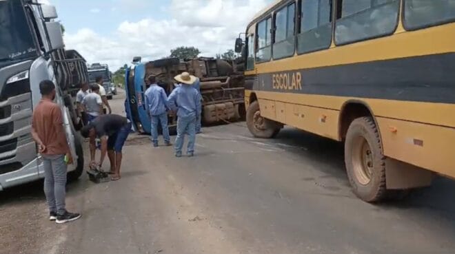 Para liberar a estrada, um ônibus escolar que seguia para buscar alunos foi utilizado para puxar o caminhão e desobstruir a passagem. Este é o segundo acidente no local em poucos dias: no último domingo, uma carreta carregada com soja também tombou ao passar pelo mesmo buraco, evidenciando as condições precárias da rodovia.