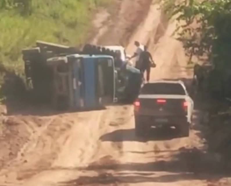 Um caminhão que transportava um trator tombou na manhã desta terça-feira (23) no Ramal do 25, na região do Cassirian, zona rural de Sena Madureira (AC). Um vídeo que circula nas redes sociais mostra o veículo de carga caído à beira da estrada, com o trator ainda preso à carroceria.