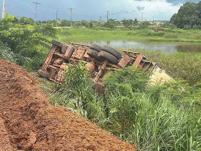 Segundo relatos do motorista, uma caçamba trafevaga na sua frente no sentido Piquiá, quando de repente avistou um carro invadindo a contramão. Com o susto e para não colidir frontalmente, o condutor realizou uma manobra brusca para a sua direita, culminando com o tombamento do caminhão baú cheio de mercadorias.