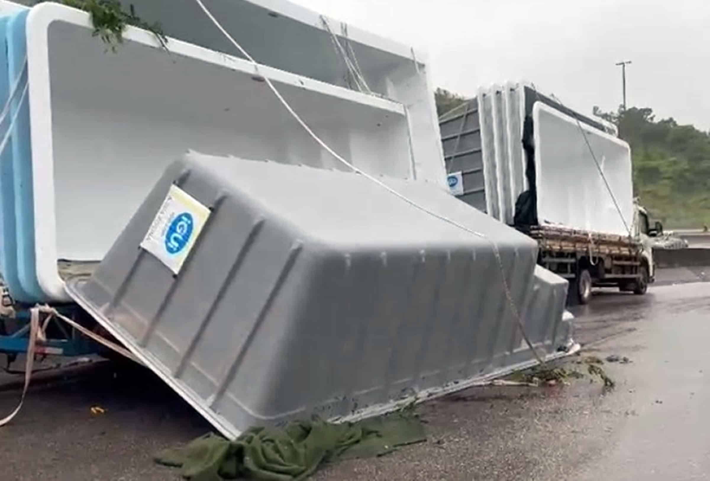A vítima foi atingida por uma das piscinas quando começava a descarregar a carga na empresa que as vende. As circunstâncias exatas do acidente serão apuradas pela polícia.