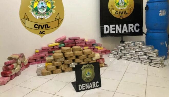 A droga, 155,5 kg de cocaína pura, estava acondicionado em tambores, sendo transportada num caminhão que vinha de Cruzeiro do Sul.