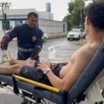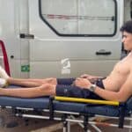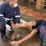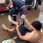 Com o impacto, o pé direito do motociclista ficou prensado entre o freio e o estribo do veículo, provocando uma laceração profunda de aproximadamente 15 centímetros, que se estendeu entre os dedos até o dorso do pé, com exposição óssea.