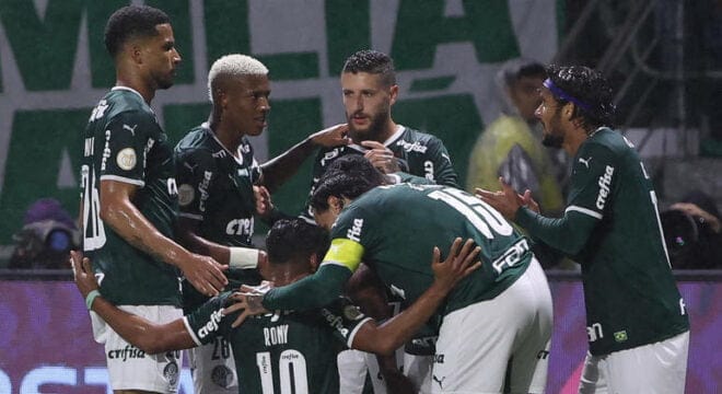 Jogadores do Palmeiras comemoram o gol marcado na goleada sobre o Fortaleza no Allianz