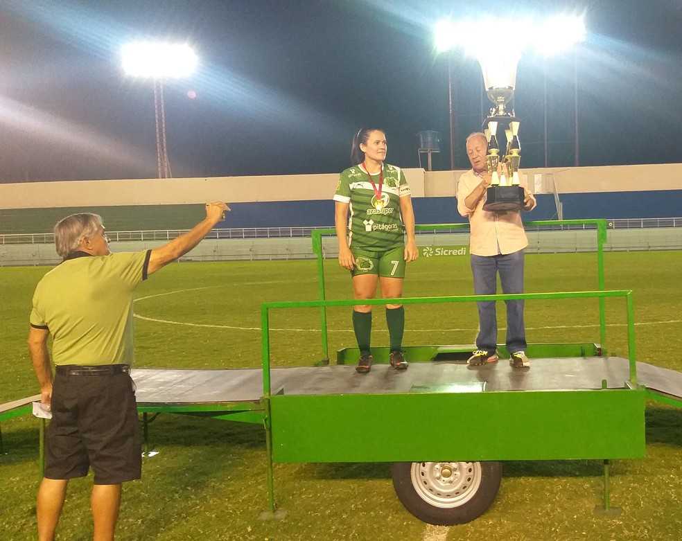 Presidente da FFAC, Antônio Aquino Lopes, com troféu do Acreano Feminino 2022 ao lado da capitã da Assermurb, Katrina — Foto: Duaine Rodrigues