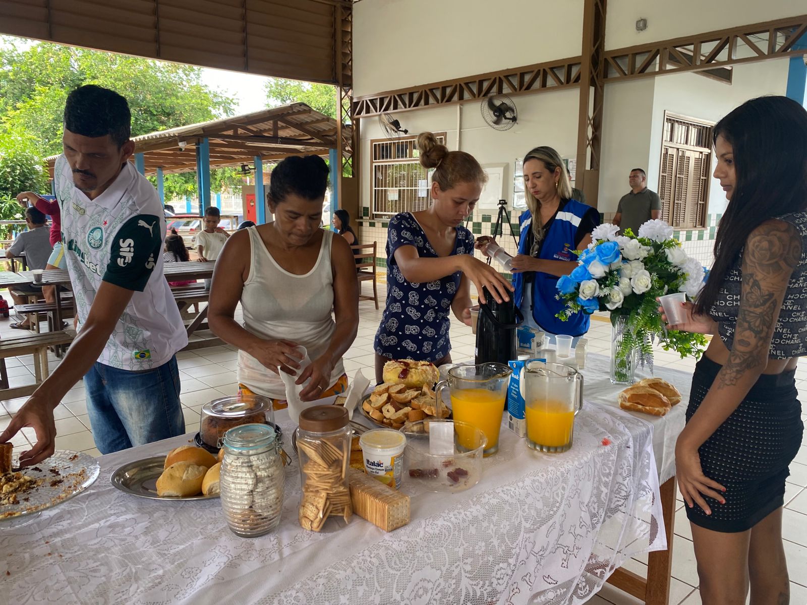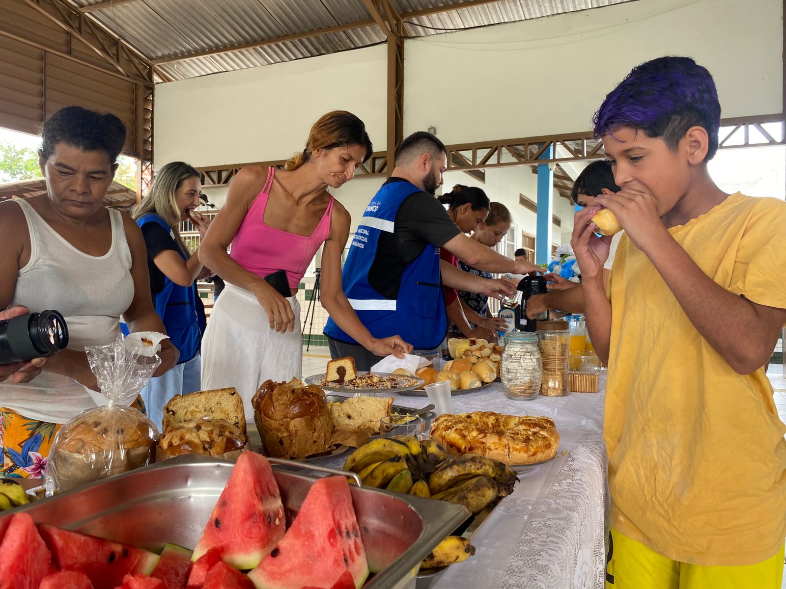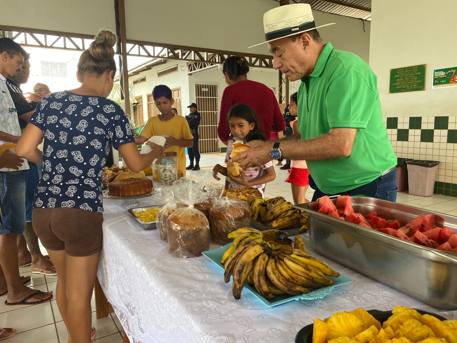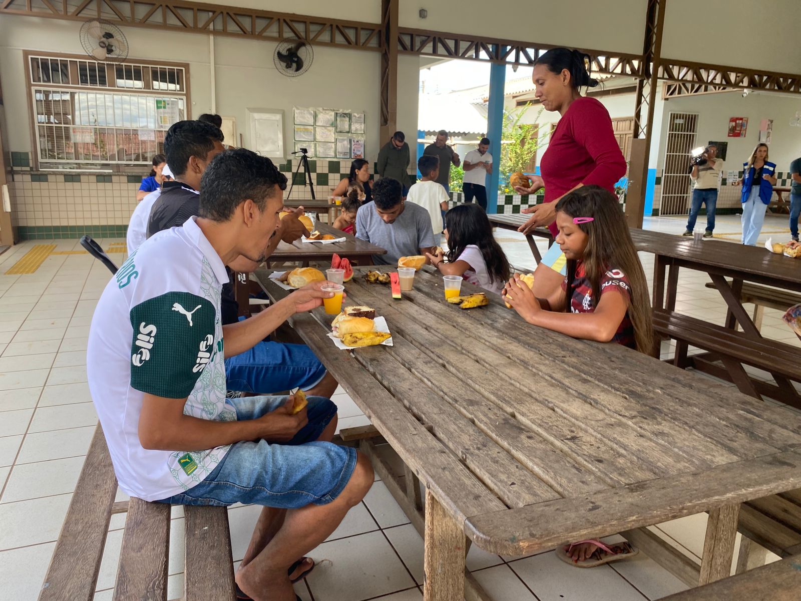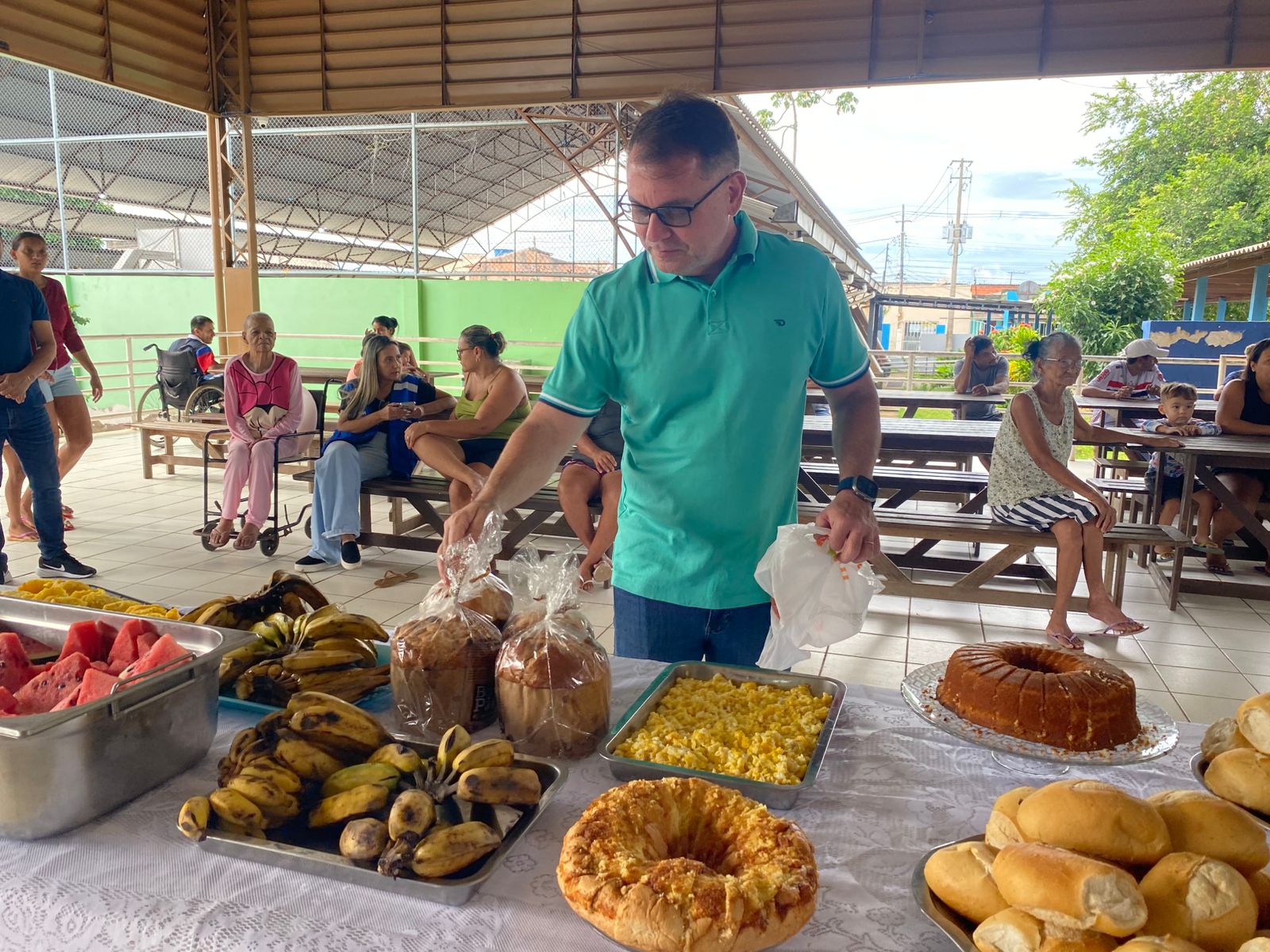 Durante a visita, o gestor compartilhou o café da manhã com os abrigados, levando pães e conversando com as famílias. (Foto: Jeferson Carvalho/Secom)