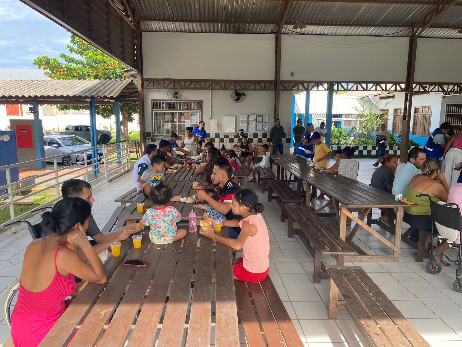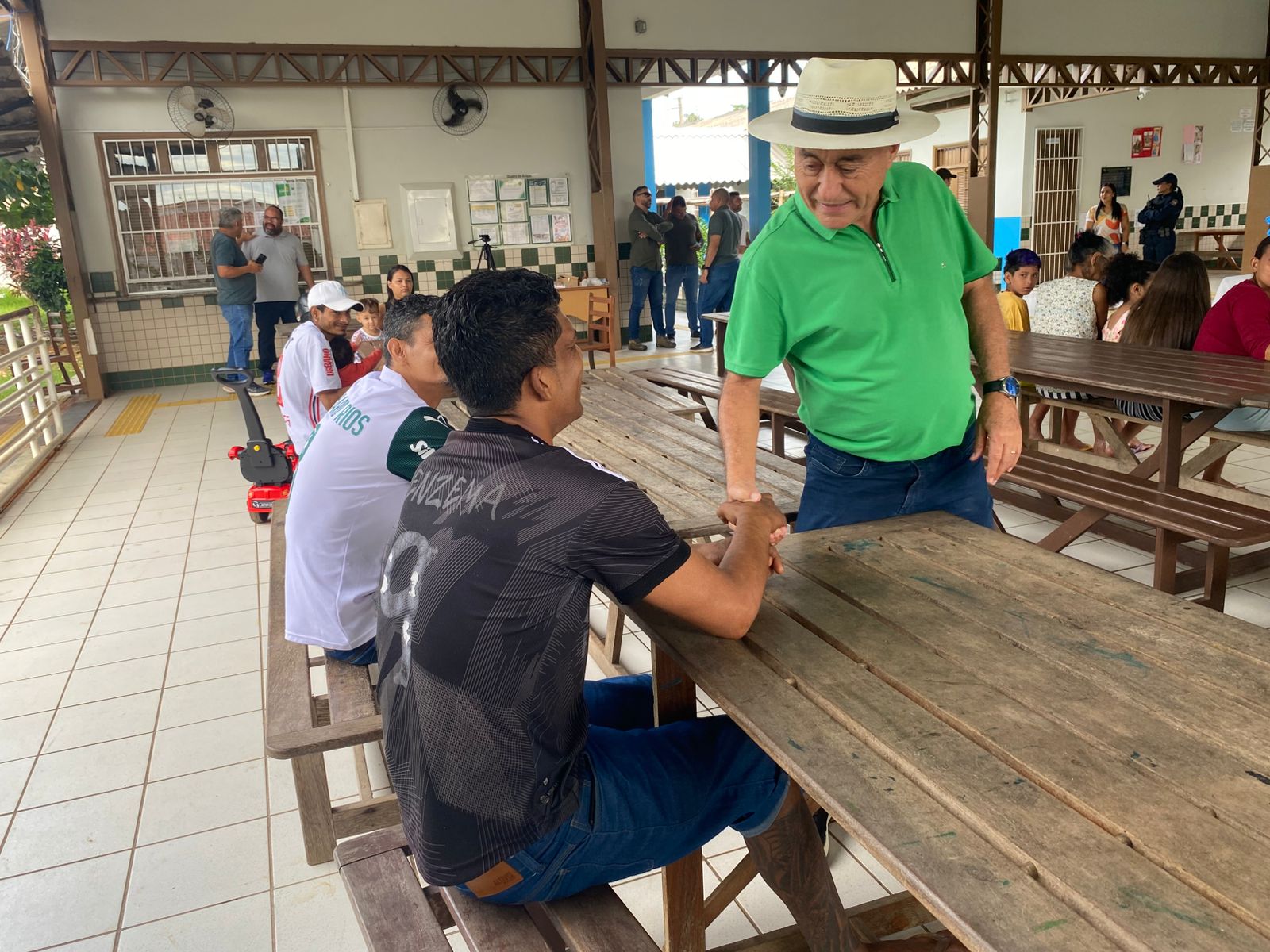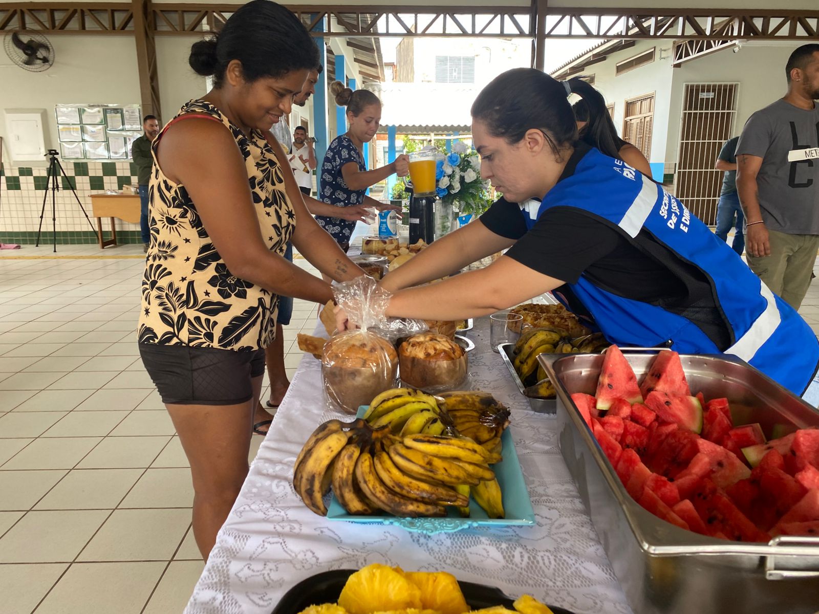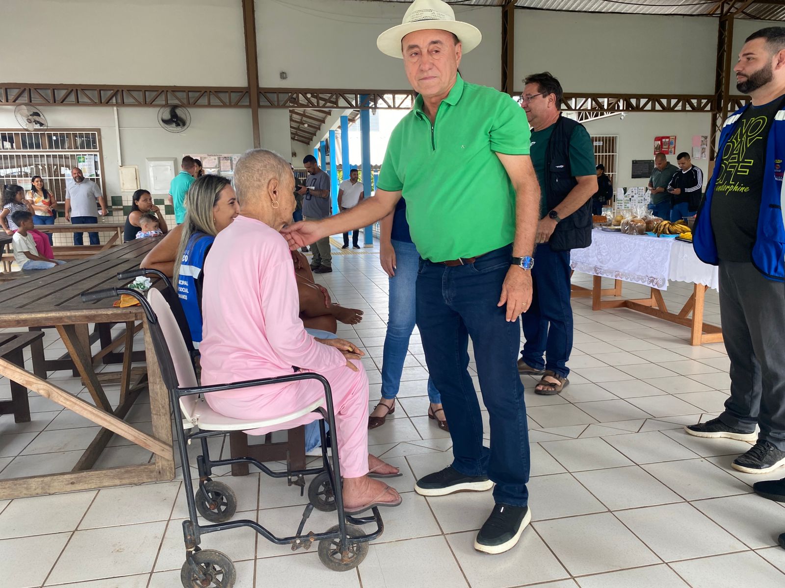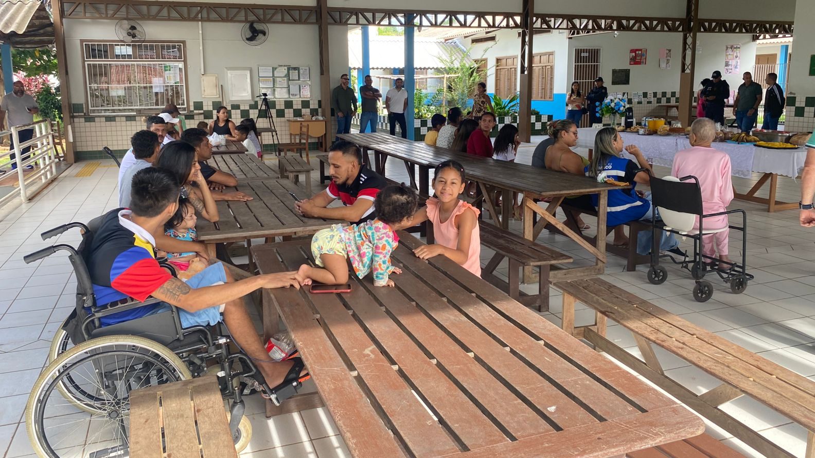 Durante a visita, o gestor compartilhou o café da manhã com os abrigados, levando pães e conversando com as famílias. (Foto: Jeferson Carvalho/Secom)