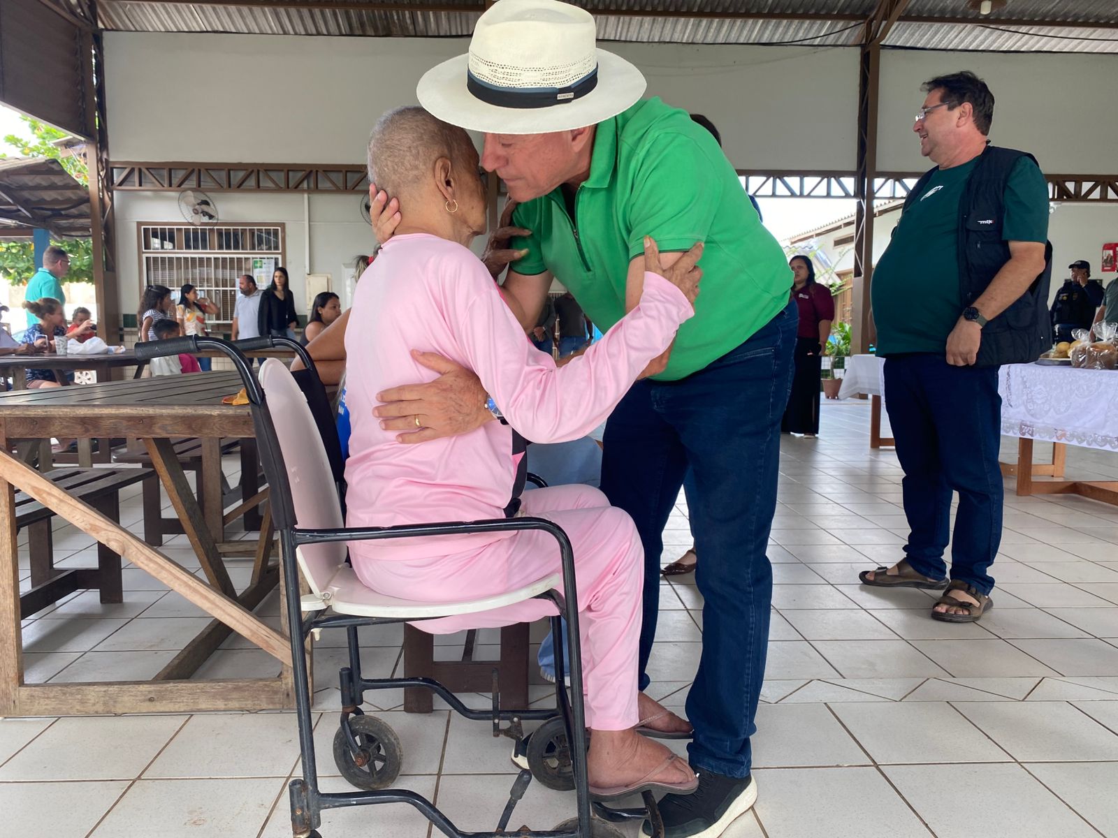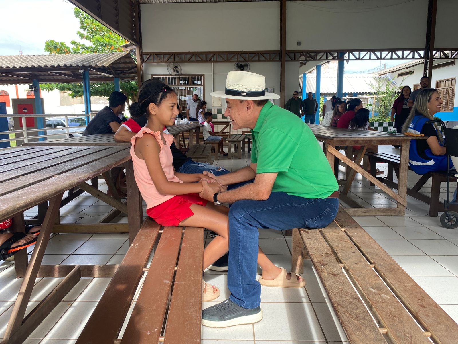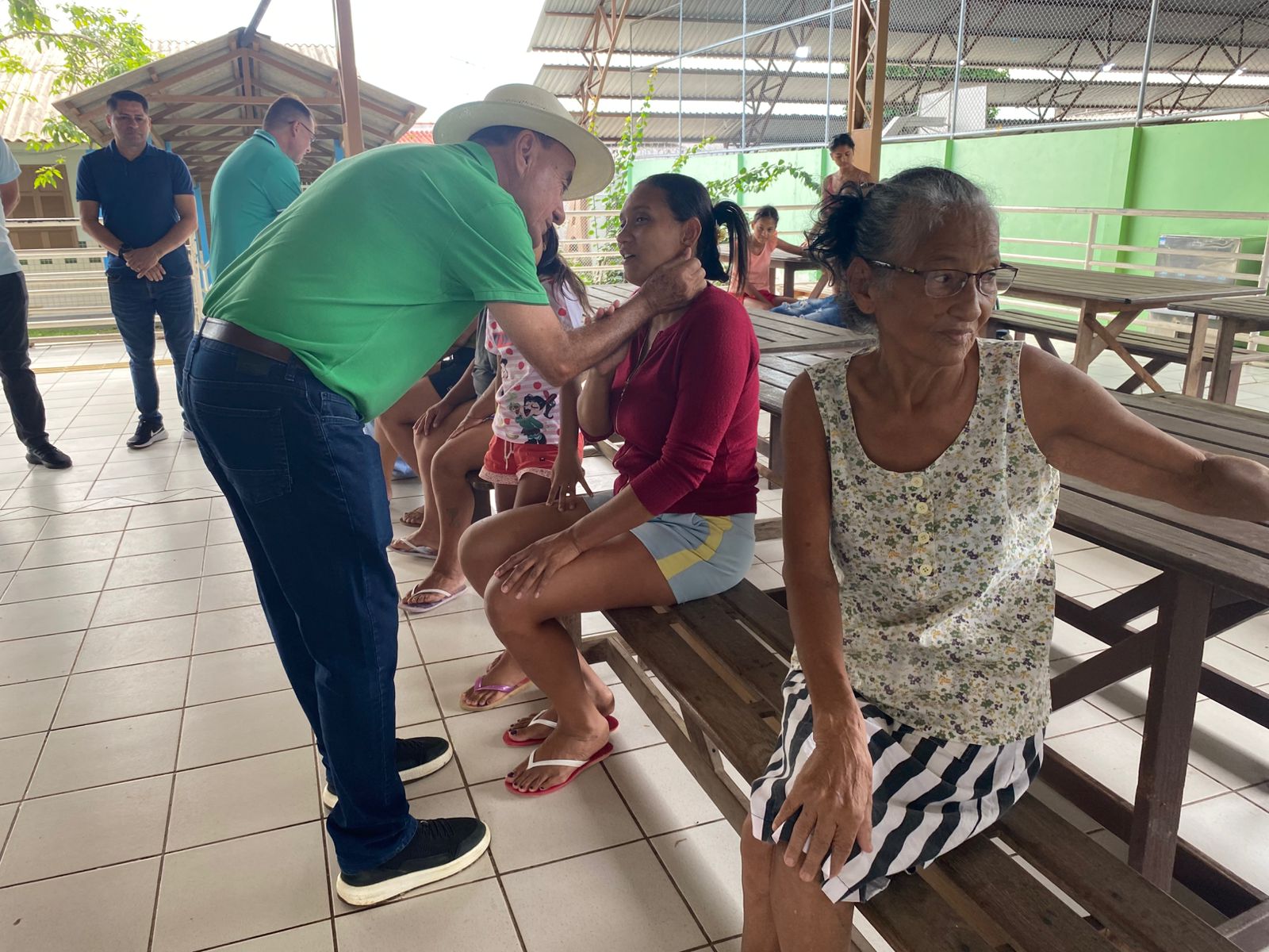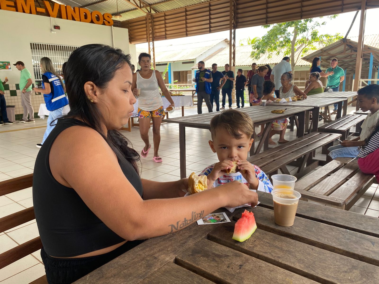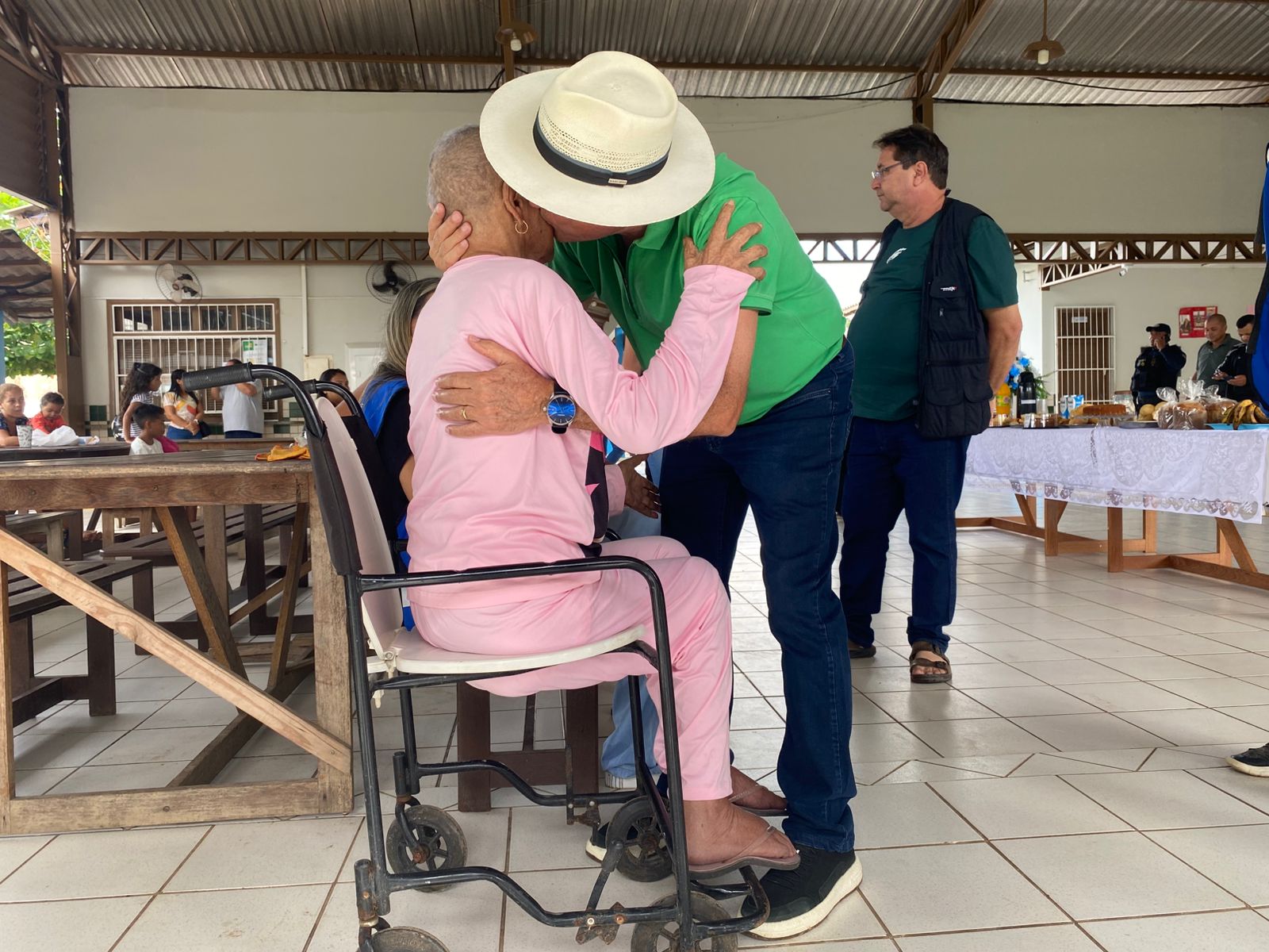 Durante a visita, o gestor compartilhou o café da manhã com os abrigados, levando pães e conversando com as famílias. (Foto: Jeferson Carvalho/Secom)