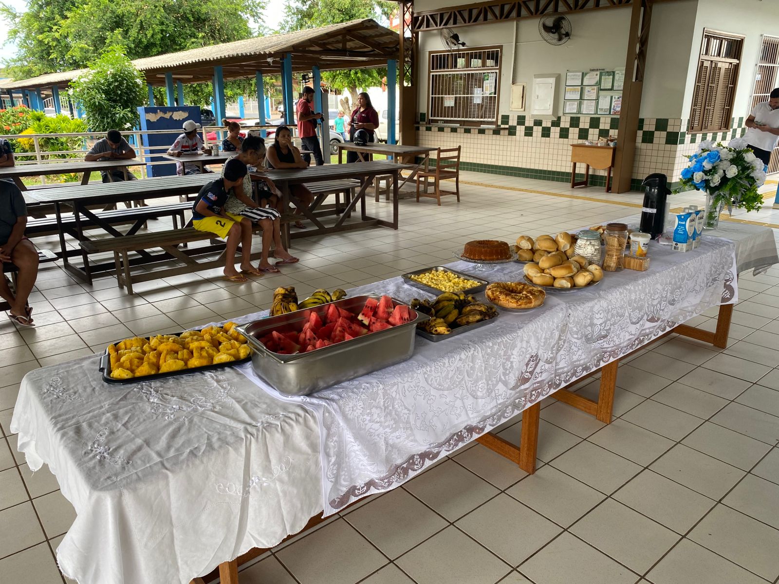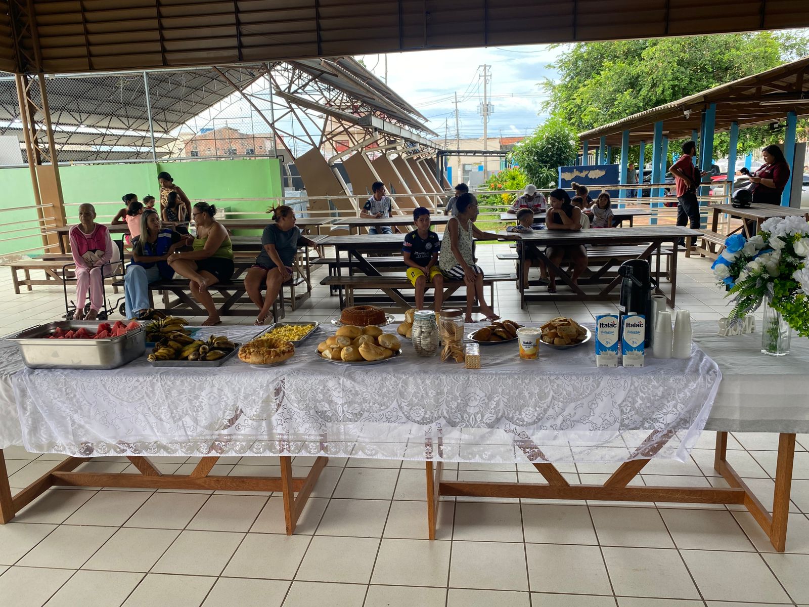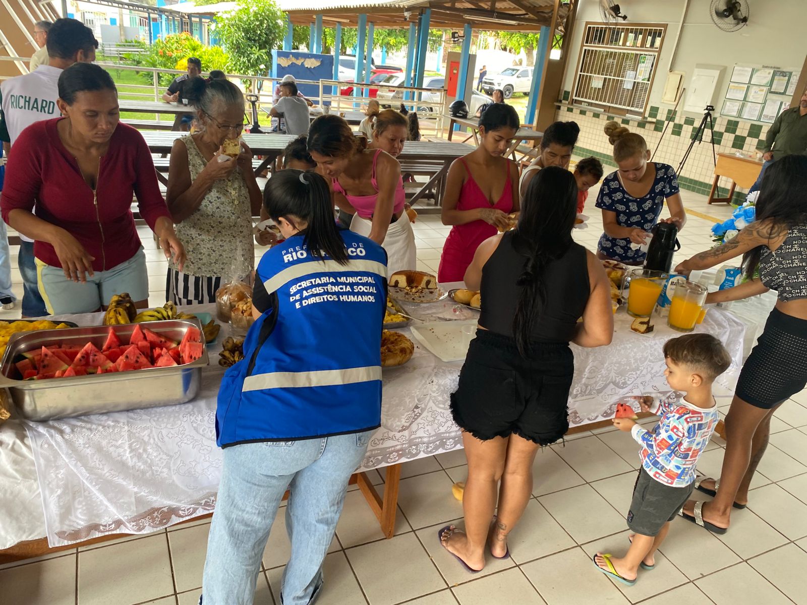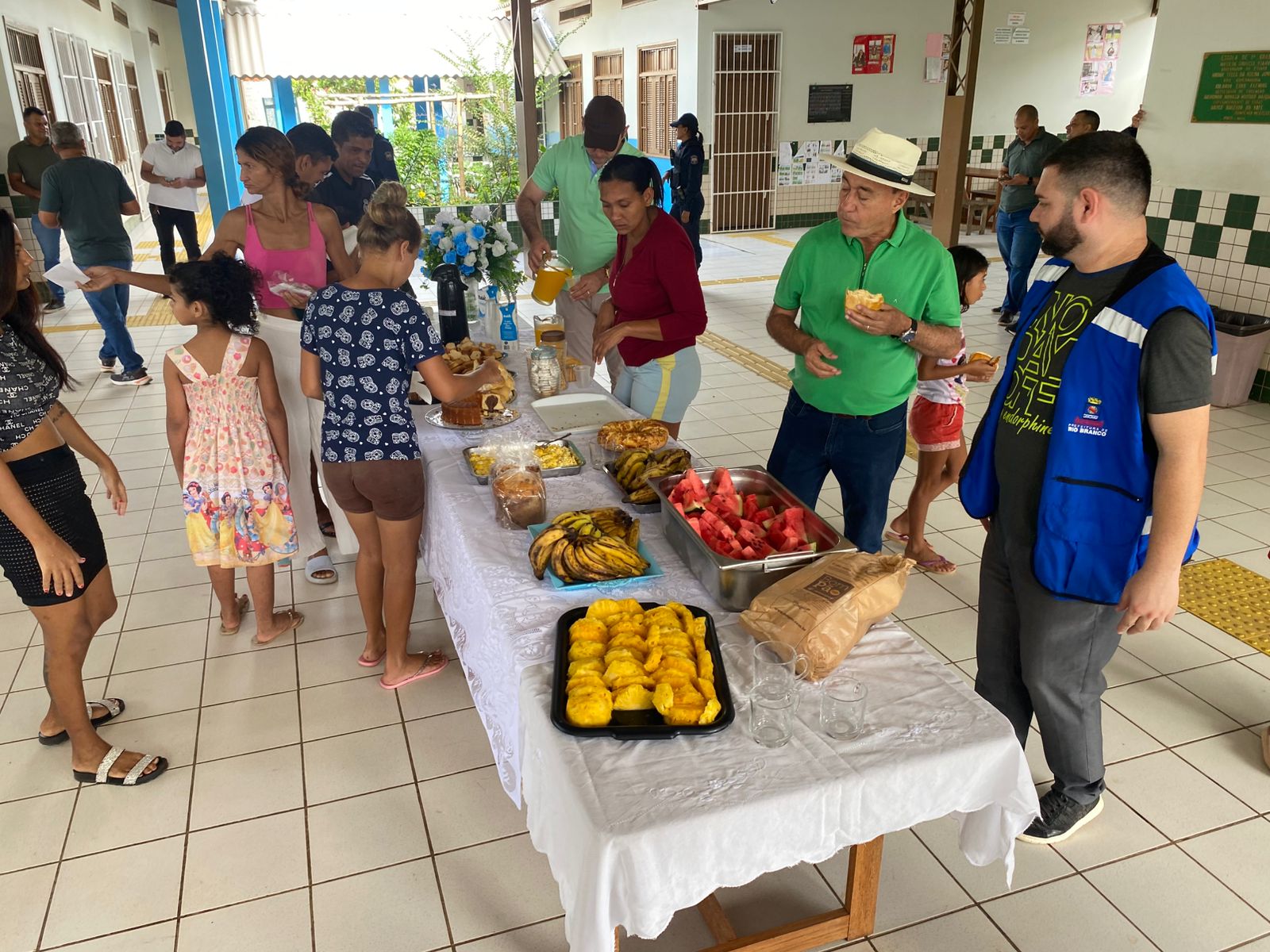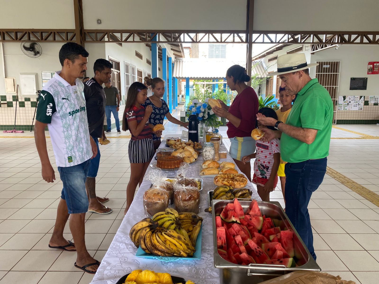 Em seguida, o prefeito visitou a Escola Estadual Marilda Gouveia Viana, no bairro João Eduardo, que atualmente abriga famílias desabrigadas pela enchente. No local, 12 famílias, totalizando 52 pessoas, estão acolhidas provisoriamente. Durante a visita, o gestor compartilhou o café da manhã com os abrigados, levando pães e conversando com as famílias.