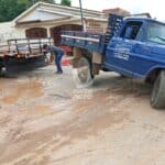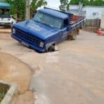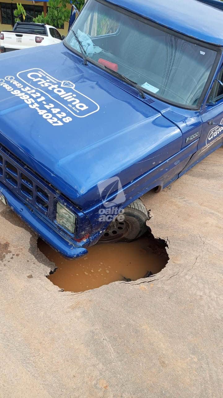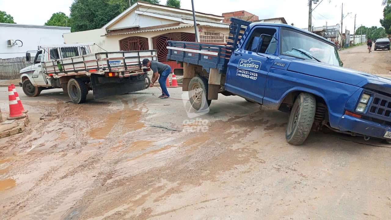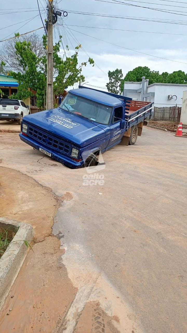 Veículo de distribuidora ficou preso no buraco e Saneacre atuou para reparar danos e restabelecer abastecimento de água