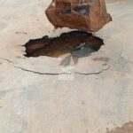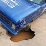 O incidente pegou um motorista de surpresa, fazendo com que o veículo de uma distribuidora ficasse com uma das rodas presas no buraco.
