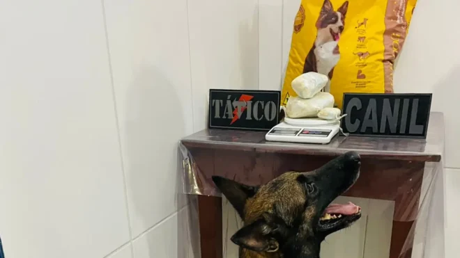 As equipes policiais realizaram uma abordagem a um veículo S10, de cor branca e, com ajuda do Cão Farejador Amora, foram encontrados dentro de um saco de ração, três pacotes de oxidado, totalizando 510 gramas, além de 205 reais e dois aparelhos celulares.