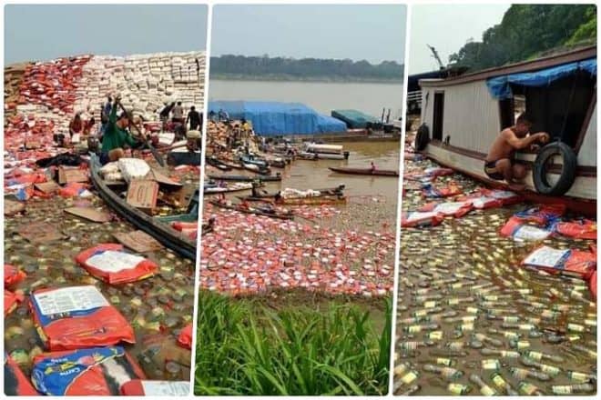 A embarcação transportava alimentos, como óleo e açúcar, e a carga precisou ser doada aos moradores ribeirinhos porque começou a cair no Madeira.