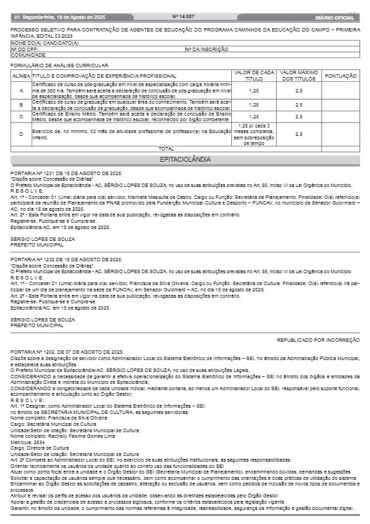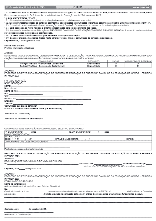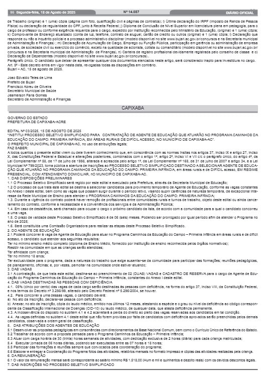 A Prefeitura de Capixaba divulgou nesta segunda-feira, 18, o Edital nº 03/2025, que abre processo seletivo simplificado para contratação temporária de agentes de educação. Os profissionais vão atuar no Programa Caminhos da Educação do Campo: Primeira Infância, em áreas rurais de difícil acesso do município.