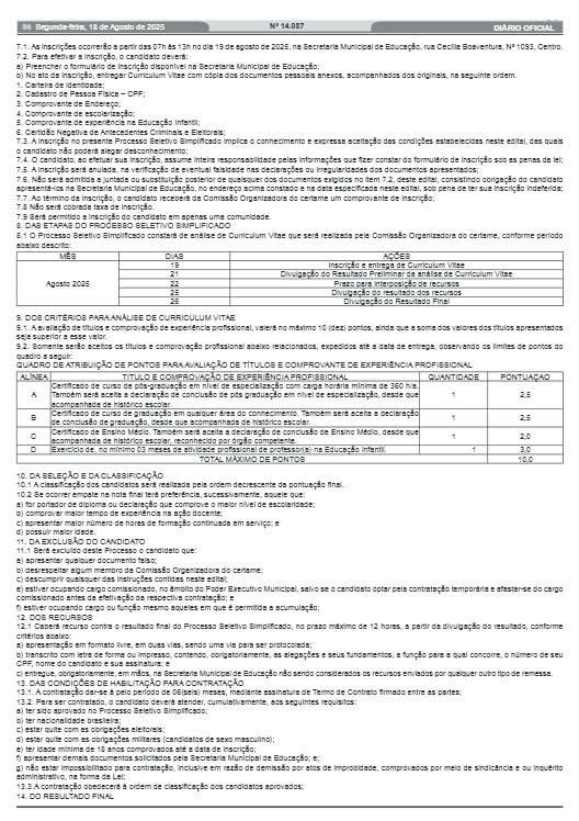As inscrições acontecem no dia 19 de agosto de 2025, das 7h às 13h, na Secretaria Municipal de Educação, localizada na Rua Cecília Boaventura, nº 1093, Centro. Os candidatos devem apresentar formulário de inscrição, currículo e documentos pessoais.