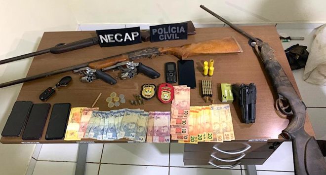 Durante a ação policial foi possível apreender cinco armas de fogo, dentre elas, duas espingardas calibre 20, uma carabina de pressão adaptada para calibre 22, dois revolveres calibre 38, além de dois simulacros de pistola. A polícia também apreendeu celulares, munições e dinheiro que supostamente é oriundo da venda de entorpecente.