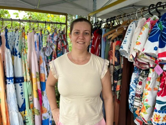 Natália tem um brechó e está presente em todas as feiras com foco em empreendedorismo feminino e de moda circular. Foto: Alice Leão/Secom