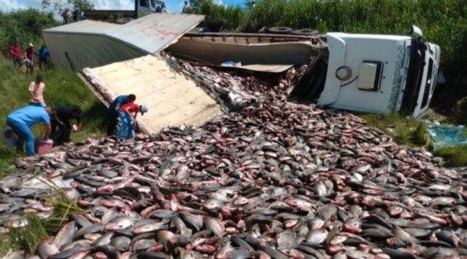 O carregamento era de tambaqui, o peixe mais consumido na região. O caminhão pertence a um frigorífico de Humaitá (AM). Pessoas que passavam pela rodovia saquearam a carga.