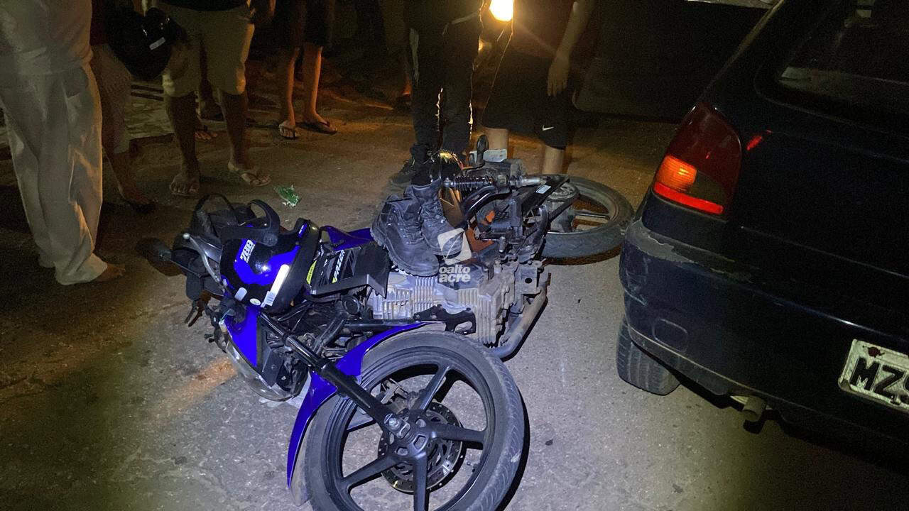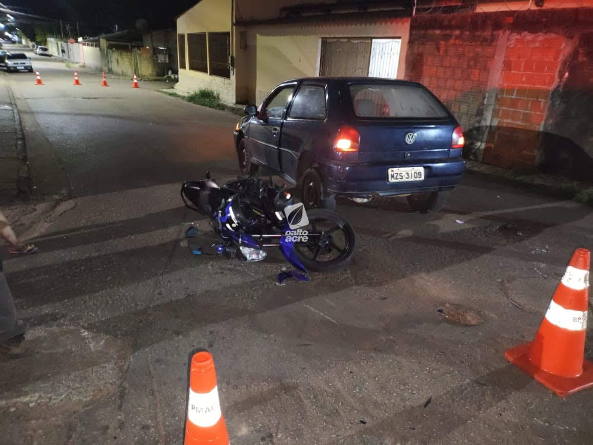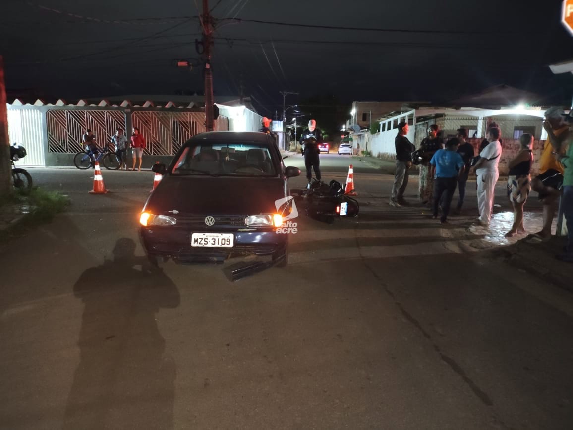 Um grave acidente deixou duas pessoas feridas na noite desta quinta-feira (27) no cruzamento das ruas Formosa e Passarela, no bairro Nova Estação, em Rio Branco. A colisão envolveu um Volkswagen Gol azul e uma motocicleta Yamaha Fazer 150 que atuava como Moto Uber.
