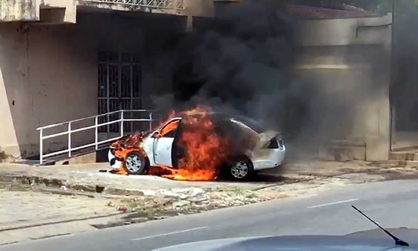 O carro estava estacionado na rua Alvorada, área comercial no bairro Bosque, quando começou a ser consumido por chamas.