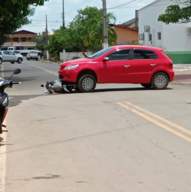 Um carro modelo VW/Gol, placas MZR 3J32, dirigido por I. R. M. de 32 anos, colidiu contra um moto no Bairro Ferreira Silva, em um cruzamento em frente ao Centro Cultural de Brasiléia próximo ao meio-dia desta sexta-feira, dia 1º de outubro.