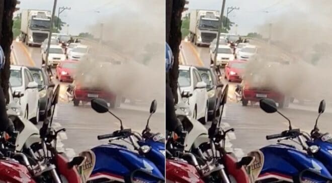 Um carro de passeio pegou fogo, na tarde desta terça-feira (18), quando o motorista descia a Ponte Coronel Sebastião Dantas, no Centro de Rio Branco.