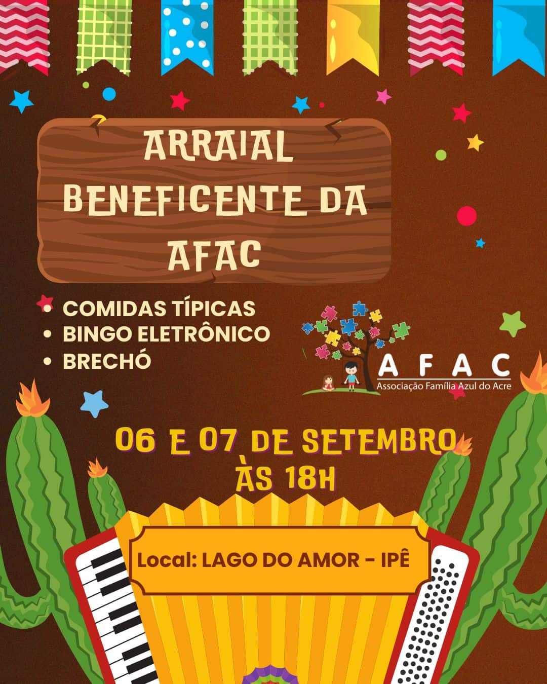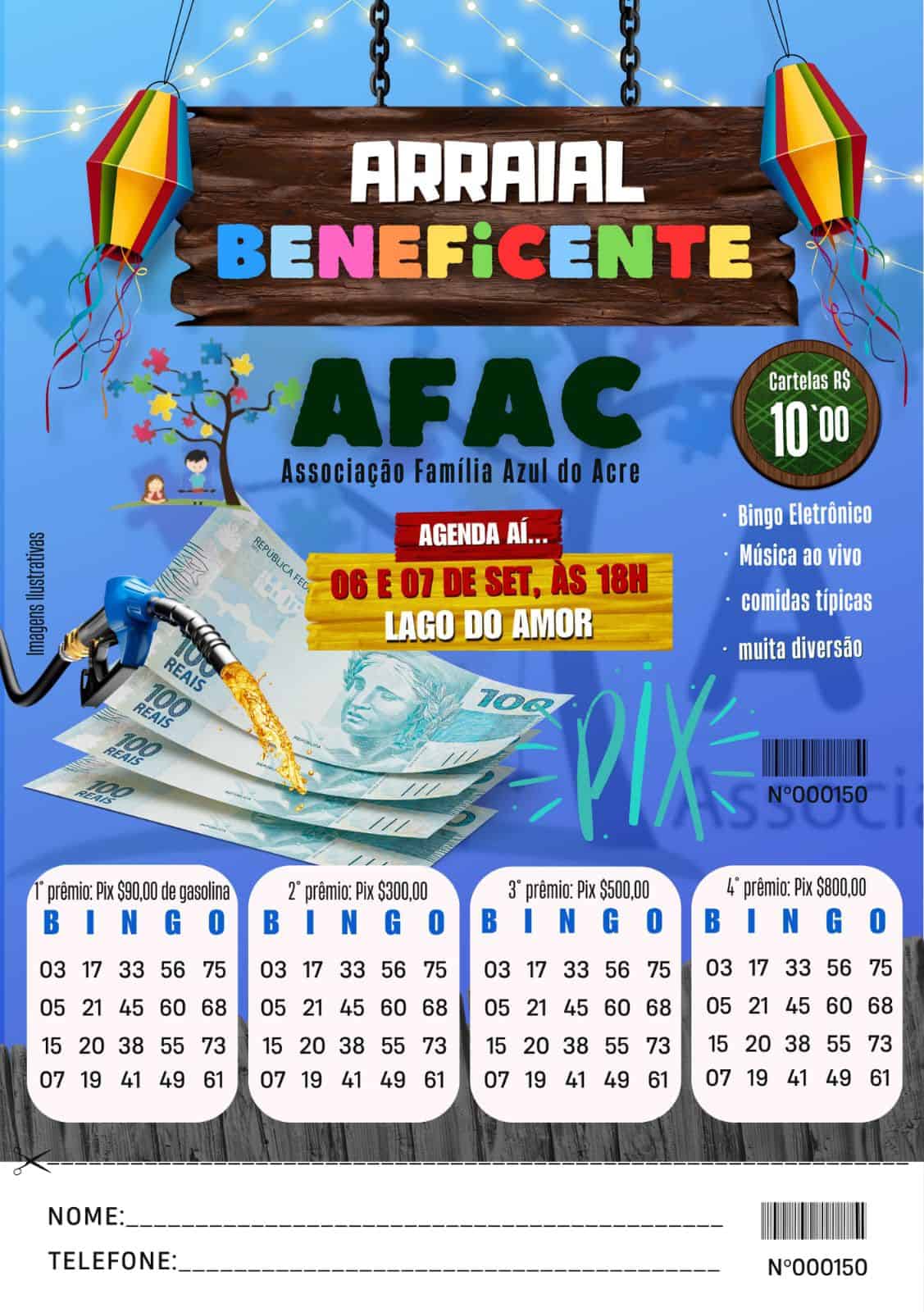 A Associação Família Azul do Acre (AFAC) realiza, nos dias 6 e 7 de setembro, a partir das 18h, no Lago do Amor – Ipê, o Arraial Beneficente, uma programação especial voltada para toda a família. O evento contará com comidas típicas, música ao vivo, bingo eletrônico com prêmios em dinheiro via Pix e brechó solidário, além de muita diversão em clima junino.