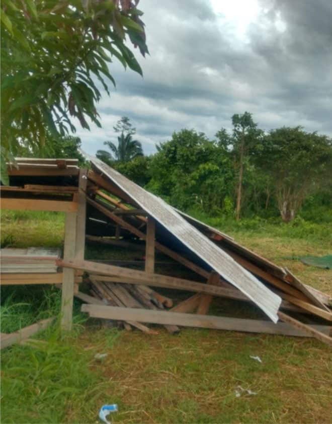 Simões disse que a casa de madeira já estava toda armada, com assoalho e cobertura prontos, faltava apenas as paredes. Mas, o vento acabou derrubando a estrutura e restou apenas o piso. As telhas e algumas peças de madeira foram quebradas e não podem ser reaproveitadas.