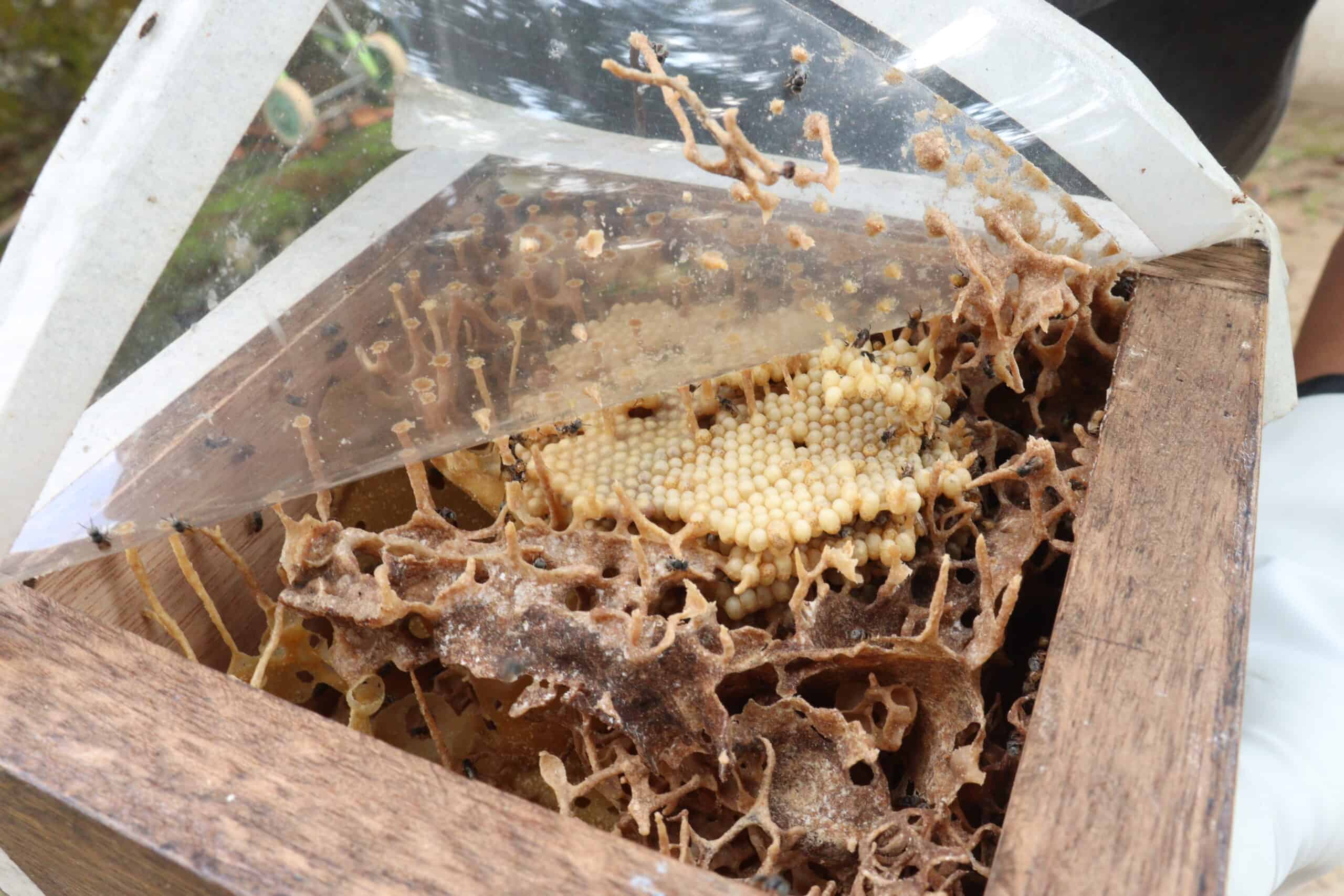 Foi a partir dessa ideia que o casal buscou aprender mais sobre a meliponicultura, a criação das caixas para as colmeias e a extração do mel. Em cada nível fica uma parte da colmeia. Nos níveis mais baixos ficam os sobre-ninhos, onde os ovos são depositados pela abelha-rainha e as larvas se desenvolvem. Nos níveis superiores fica a melgueira, com armazenamento de pólen e produção do mel. É desse nível que o mel é extraído.