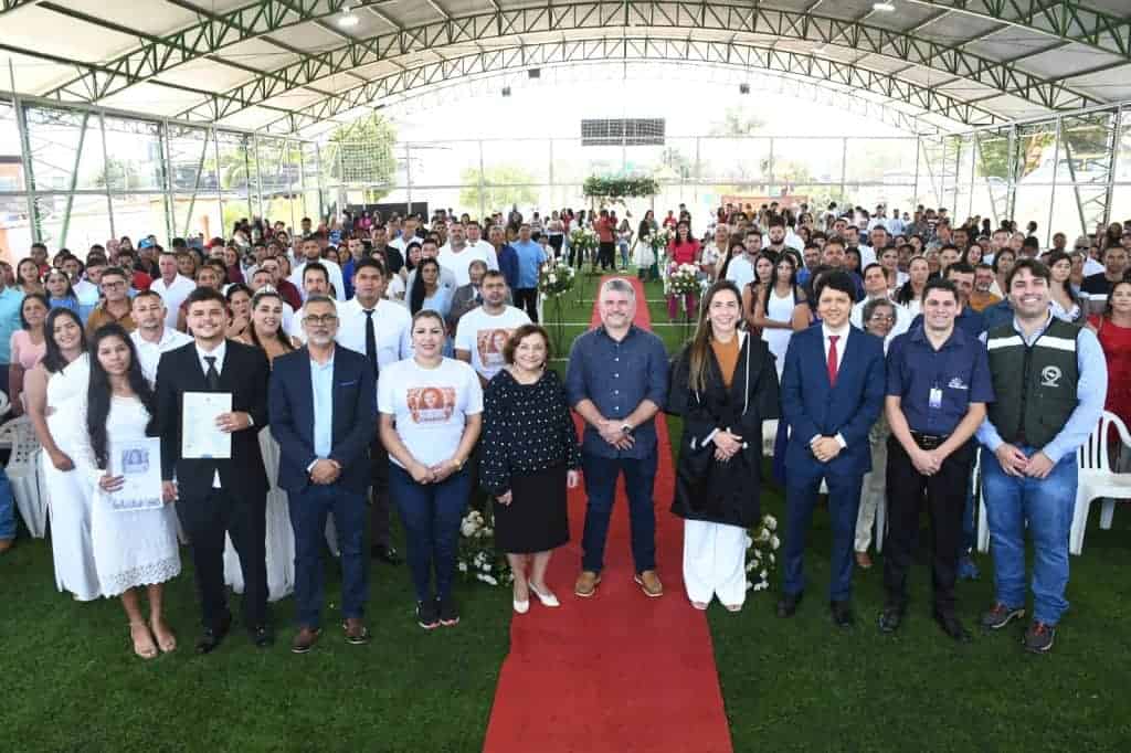 Neste sábado, 1º de julho, a quadra da Praça 28 de Abril, em Epitaciolândia, se transformou em um cenário de celebração para 107 casais que decidiram oficializar sua união em um emocionante Casamento Coletivo, com direito a decoração, tapete vermelho, espaço para fotos e bolo.