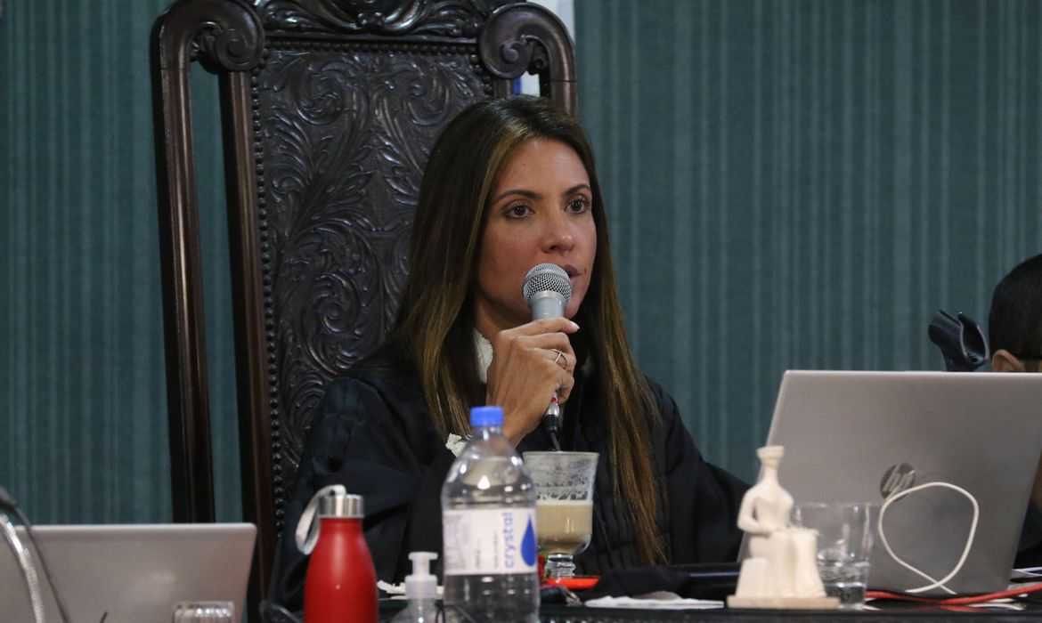 A juíza Nearis dos Santos Carvalho Arce, da 3ª Vara Criminal de Niterói, durante o julgamento de quatro dos nove acusados de envolvimento na morte do pastor Anderson do Carmo, executado a tiros em junho de 2019, pelo Tribunal do Júri de Niterói.