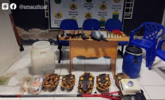 Durante a abordagem no igarapé Arara, foram encontrados jabutis vivos e carne de 11 animais silvestres abatidos — incluindo quatro porcos-do-mato, cinco macacos guariba, um jacaré e um mutum —, além de seis quilos de sal e insumos para conservação. Na embarcação dos suspeitos, os policiais apreenderam cinco armas de fogo artesanais, munições e equipamentos de caça.