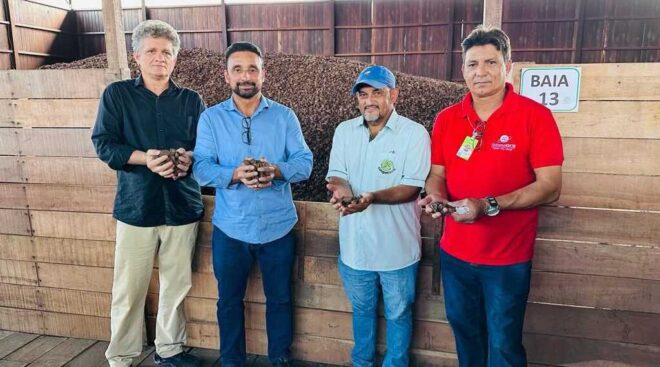 Adem Araújo foi recepcionado pelo presidente e o superintendente da Cooperacre, Manoel Monteiro e José de Araújo Rodrigues, respectivamente, e pelo presidente do Sistema OCB no Acre, Valdemiro Rocha, que apresentaram a agroindústria e explicaram o processo de beneficiamento da castanha, desde a chegada até o empacotamento do produto para exportação.