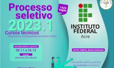 O Instituto Federal do Acre (Ifac) abre inscrições, a partir desta terça-feira (08.11), para o Processo Seletivo 2023/1 de cursos técnicos integrados e subsequentes. Estão sendo...