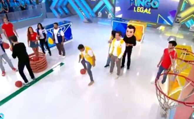 Após o tempo para os participantes acertarem a bola ao cesto acabar, o apresentador comentou: “Não é assim… É assim, dá uma olhadinha, dá uma bola aqui na minha mão. De costas, vamos lá!”.