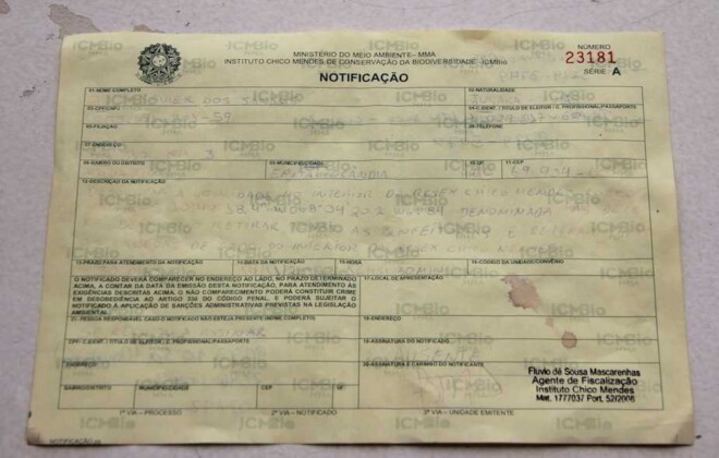 Notificação emitida para um dos moradores pelos agente do ICMBio - Foto: Alexandre Lima