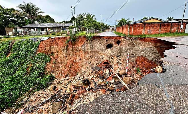 As chuvas intensas que atingiram Rio Branco entre esta quarta (3) e quinta-feira (4) causaram desmoronamento no cruzamento entre as ruas Campo Grande e Raimundo Melo, no bairro Ayrton Senna.
