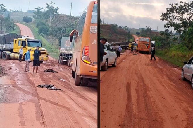 A manhã desta quarta-feira, 30 de julho, foi marcada por mais um capítulo do descaso com a infraestrutura da Estrada do Pacífico, no Acre. Um trecho próximo à cidade de Assis Brasil, a cerca de 10 km da área urbana, tornou-se praticamente intransitável após a chuva expor um atoleiro que quase fez tombar uma carreta carregada, gerando longas filas de veículos, entre caminhões, ônibus e carros de passeio.