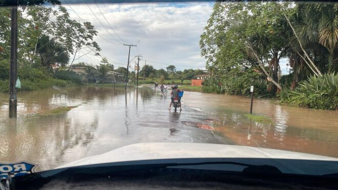 Uma forte chuva atingiu o município de Feijó, no interior do Acre, na noite de sábado (22) e continuou durante a madrugada, causando alagamentos em várias regiões da cidade. Ruas, avenidas e casas foram invadidas pela enxurrada, deixando moradores em situação de vulnerabilidade e causando prejuízos materiais.