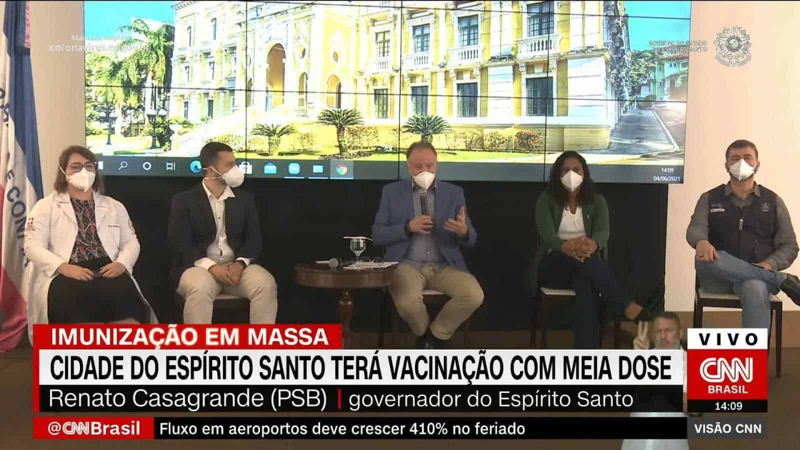 O anúncio sobre o teste da vacina de Oxford foi feito hoje pelo governador do Espírito Santo, Renato Casagrande, e o ministro da Saúde, Marcelo Queiroga. Também participam da coletiva o secretário de Estado da saúde, Nésio Fernandes, e representantes da OPAS e Fiocruz.